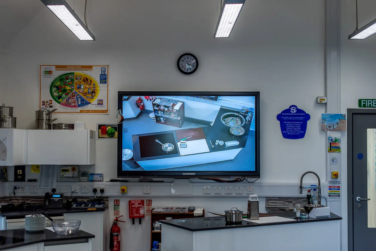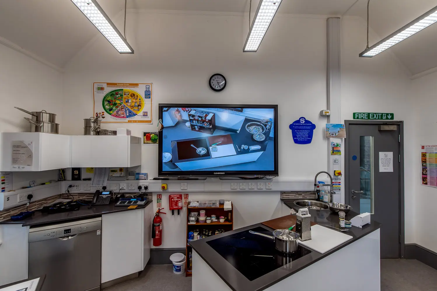 Dans les salles d'enseignement des sciences domestiques, les conditions sont moins difficiles. Les luminaires suspendus Thorlux Zipline offrent un bon éclairage vertical et un bon modelage, et ont été utilisés avec succès.