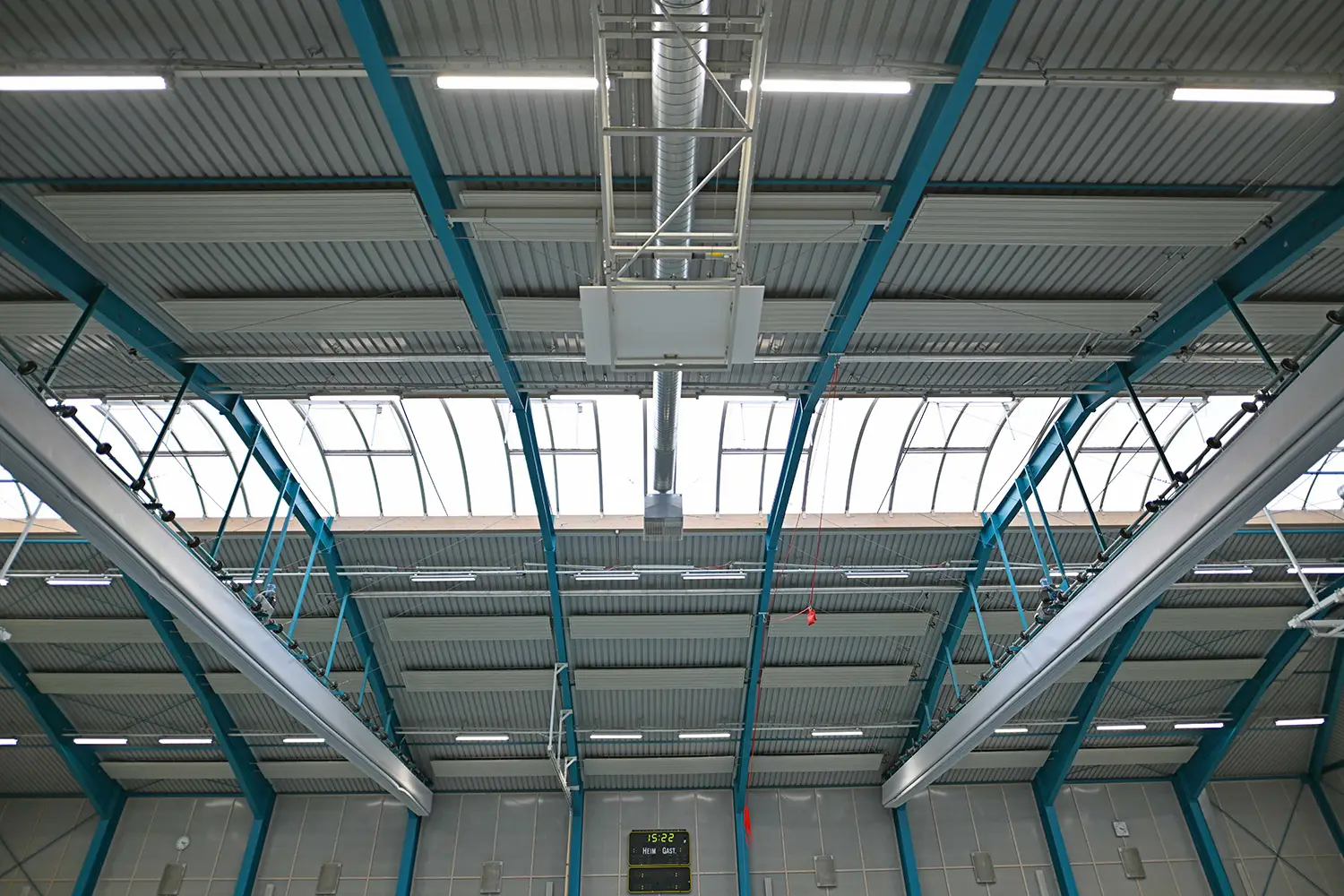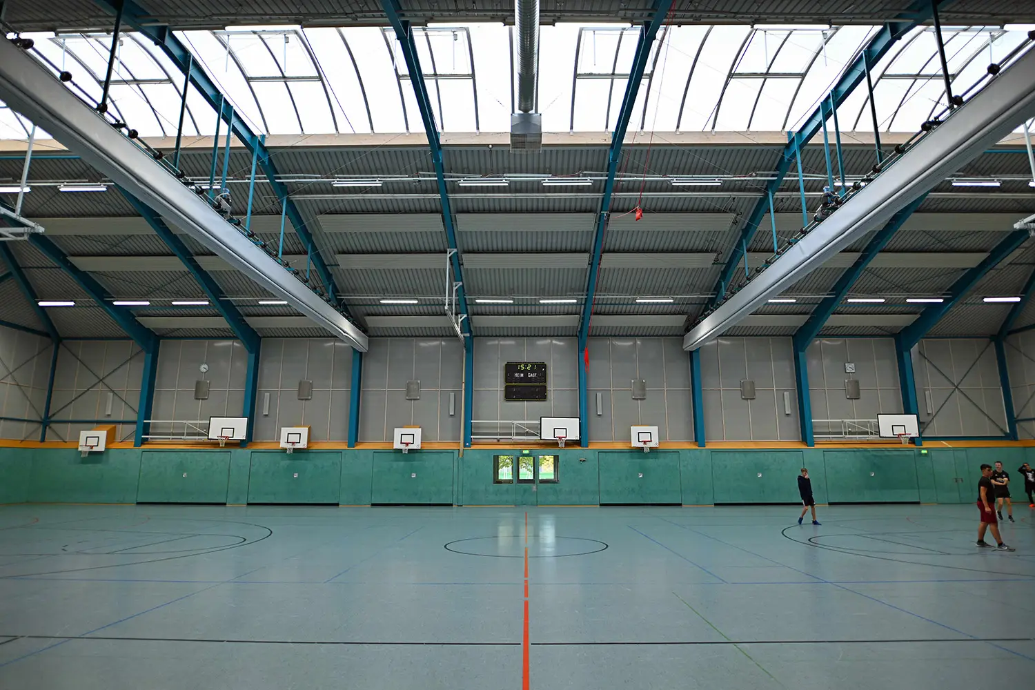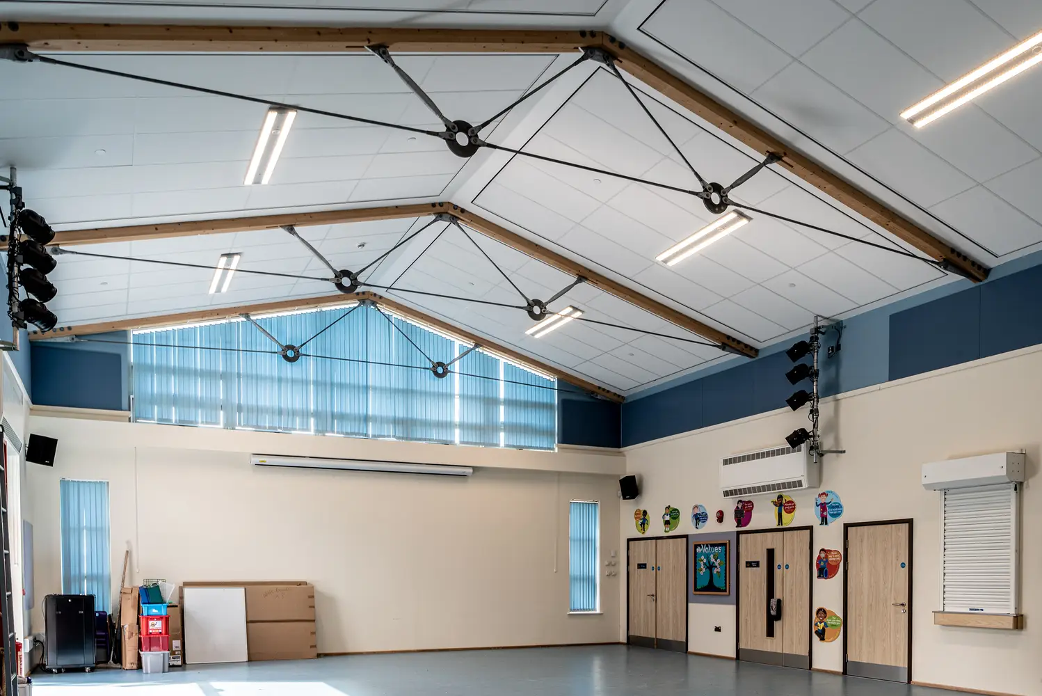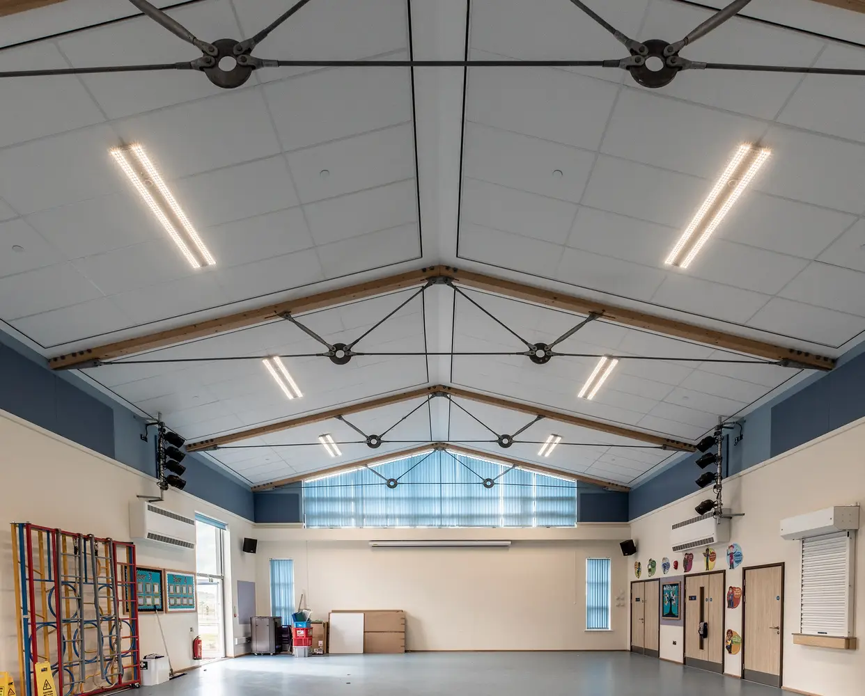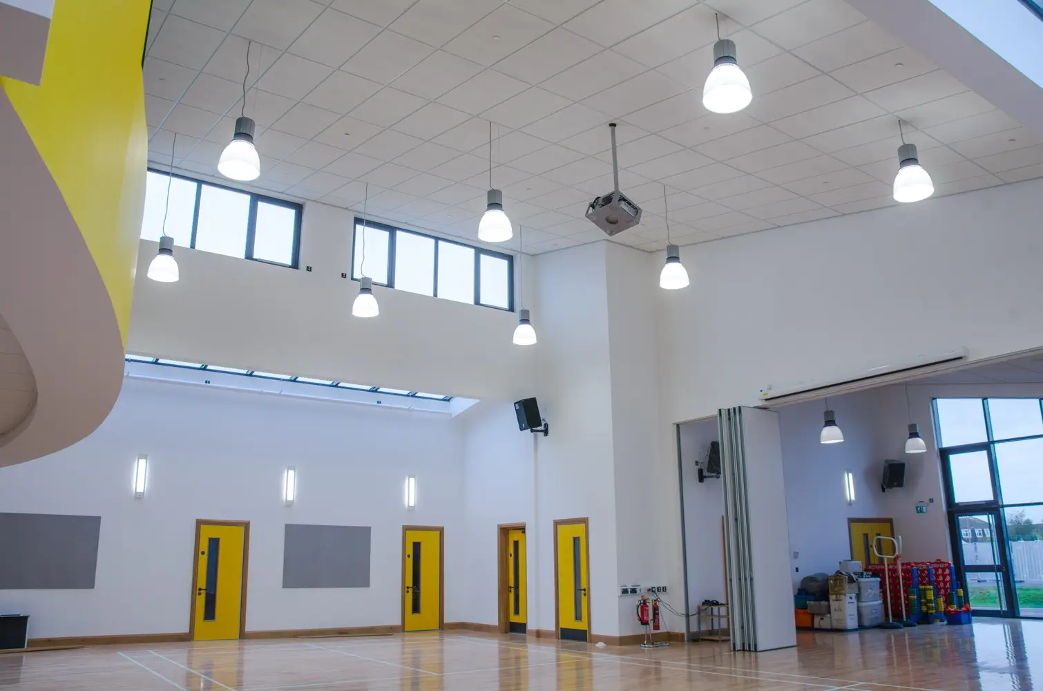 Le choix du luminaire dépendra de l'utilisation de l'espace. Dans les salles polyvalentes des écoles primaires, les luminaires apparents ou suspendus, tels que le Visio Sport, peuvent être adaptés car leur large distribution offre un bon éclairage cylindrique et illumine les murs et le plafond, créant ainsi un environnement lumineux et accueillant. Si un luminaire encastré est nécessaire, le SkyDome offre une distribution similaire.