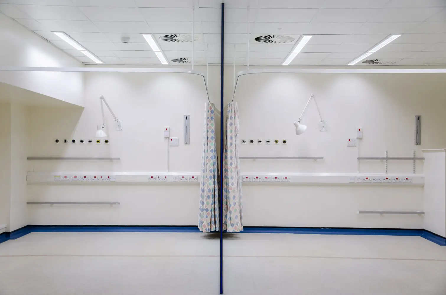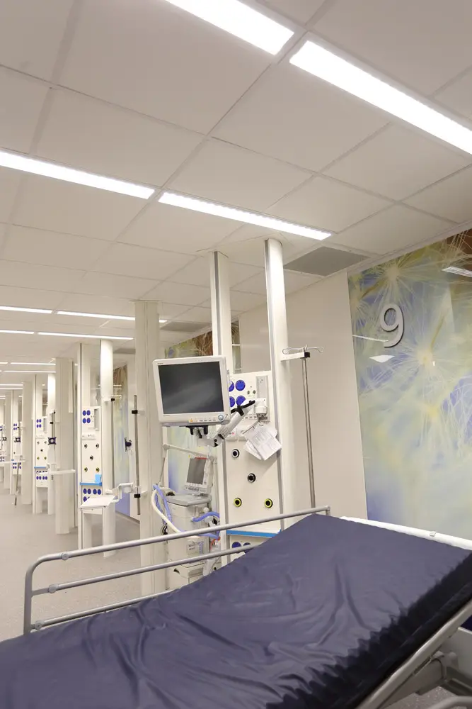 - Éclairage pour les patients : éclairage vers le bas dans la zone de lecture/d'activité. Il est souvent possible de régler l'intensité lumineuse à partir du combiné d'appel infirmier du patient, ce qui augmente le confort du patient et lui donne un certain contrôle sur son environnement immédiat.