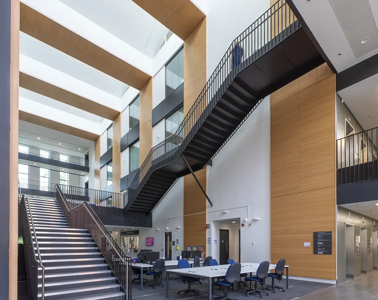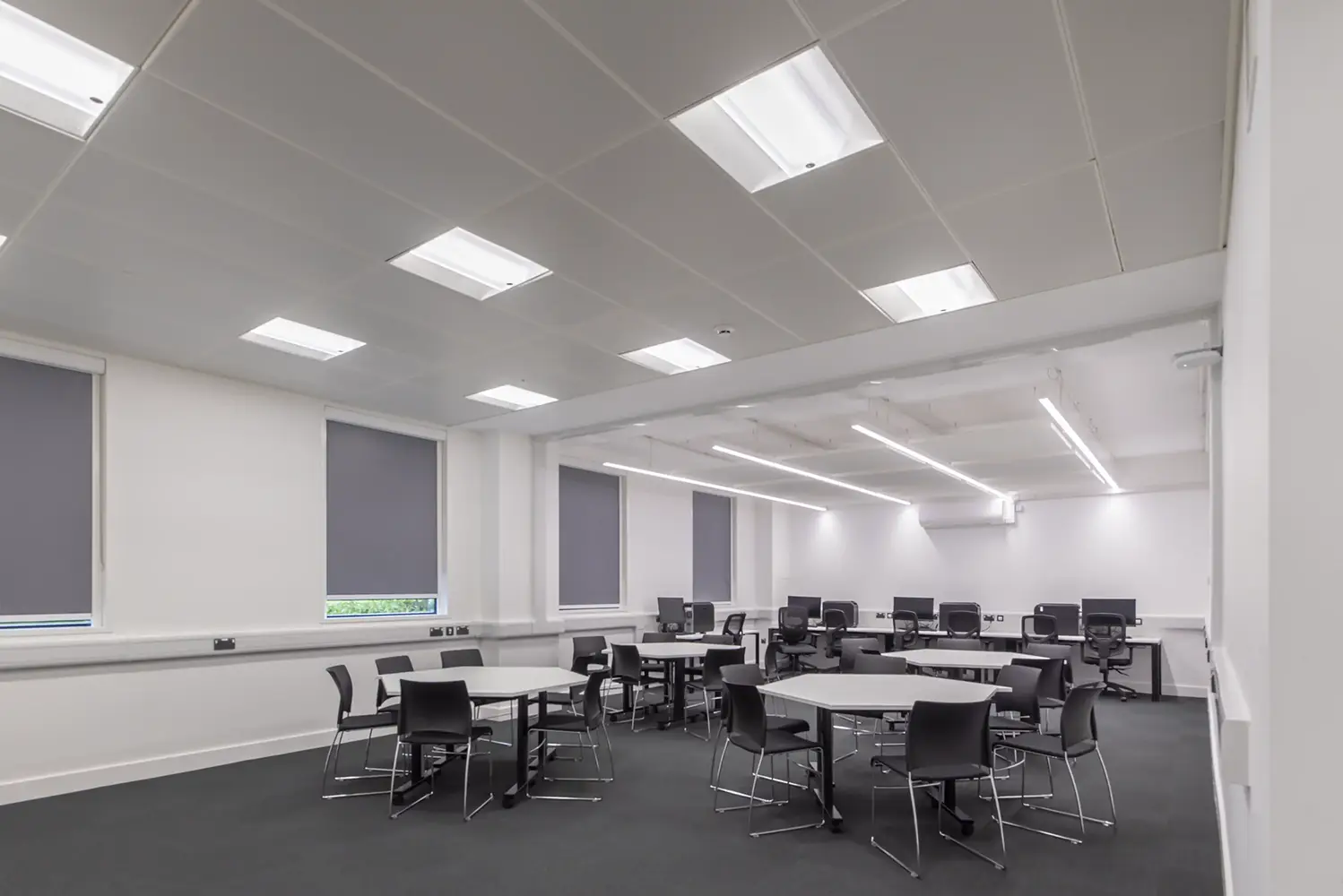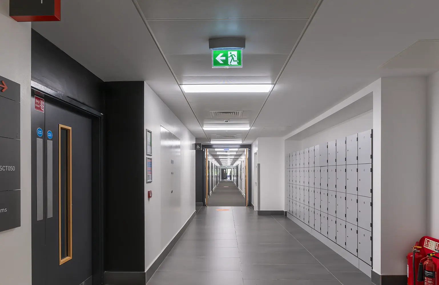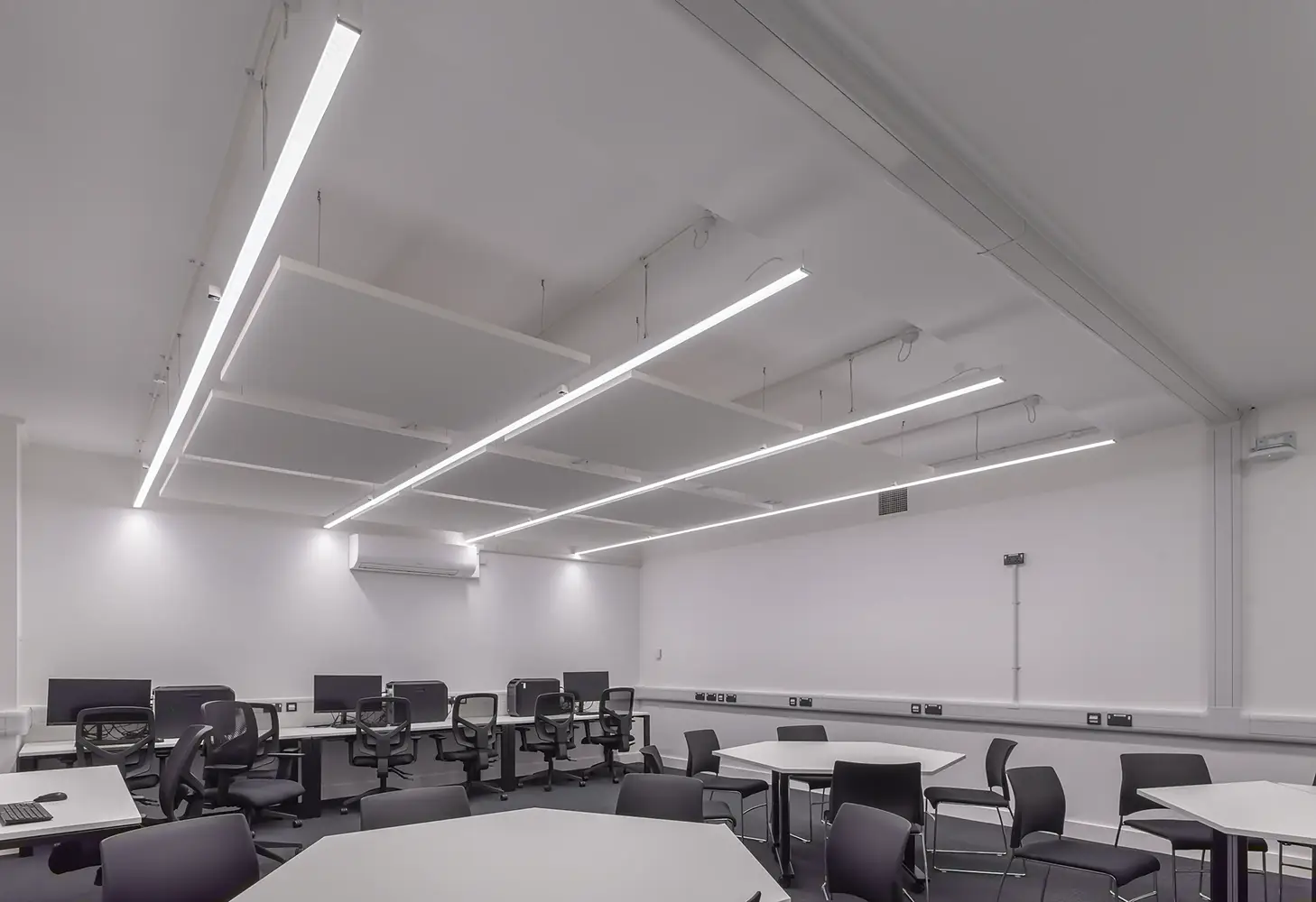 Les parties les plus anciennes du bâtiment Seacole étaient principalement éclairées par de vieux luminaires fluorescents de 600 x 600 mm répartis sur quatre étages. Thorlux a principalement modernisé ces zones avec des luminaires LED Hi-Style modernes, désormais contrôlés par le système de gestion d’éclairage SmartScan. Les remplacements ont été effectués luminaire par luminaire, mais avec des configurations mises à jour si nécessaire pour répondre aux exigences des normes britanniques et à l’utilisation actuelle des espaces.