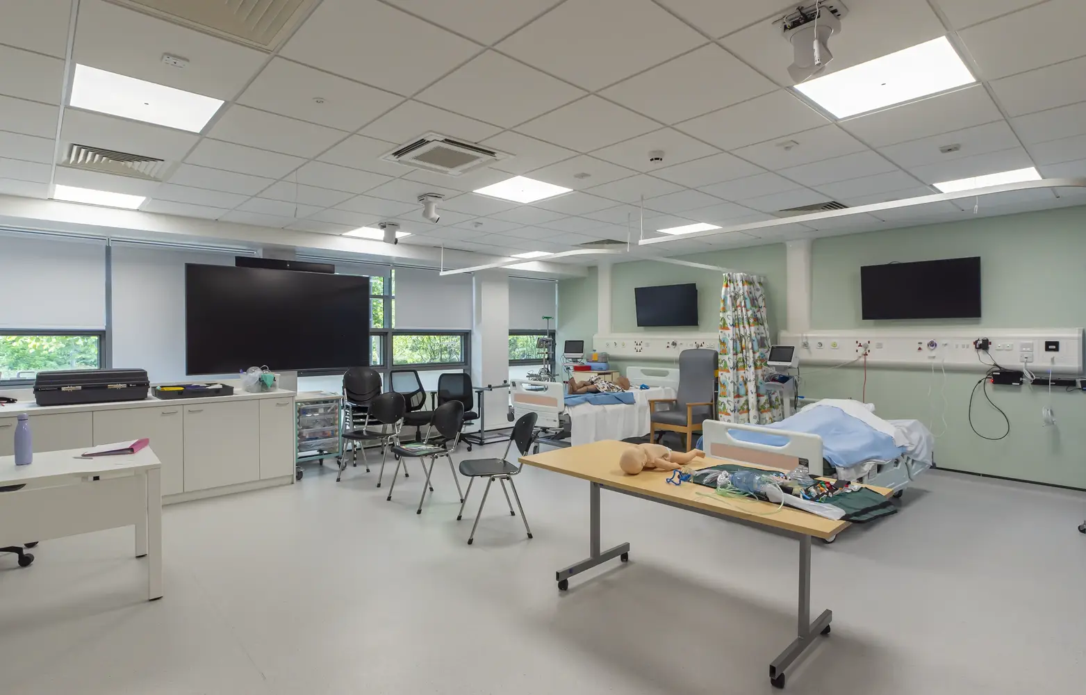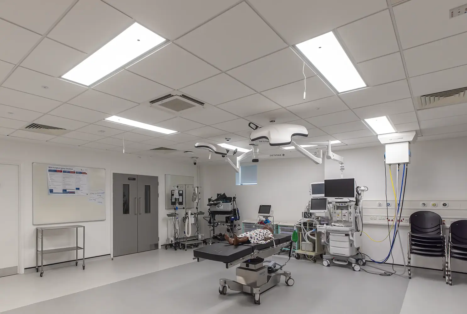 Parmi les principales applications dans le reste du bâtiment, on peut citer l’utilisation de luminaires Kanby Zip suspendus sur rail dans la bibliothèque afin d’assurer un bon niveau d’éclairage vertical sur les rayonnages (indispensable pour une consultation confortable) ; des luminaires linéaires Flexbar Diffuser attirant l’attention sur l’avant des espaces de présentation et de conférence ; et un éclairage froid à CRI élevé avec des luminaires Radiance dans les espaces simulant des salles d’hôpital, comme on en trouverait dans un véritable hôpital.