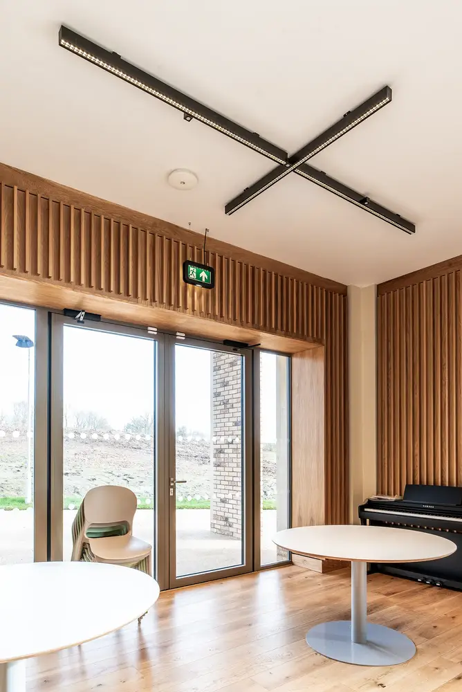 Élégant et fin, le Flexbar a été conçu pour offrir un éclairage confortable et peu éblouissant, avec un rendement optimisé de 160,5 LL/CW. Il s’est révélé idéal pour les espaces communs d’Earle House, contribuant à créer un cadre de vie accueillant et confortable pour les élèves.