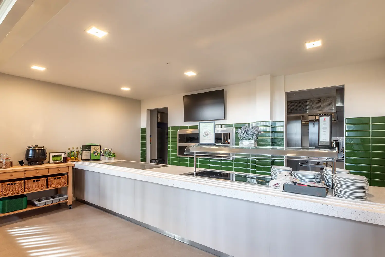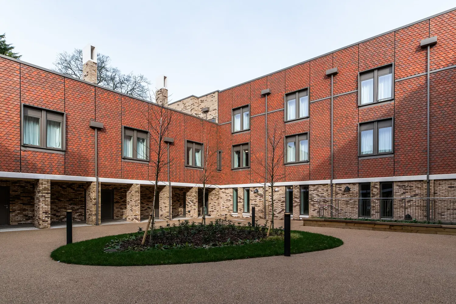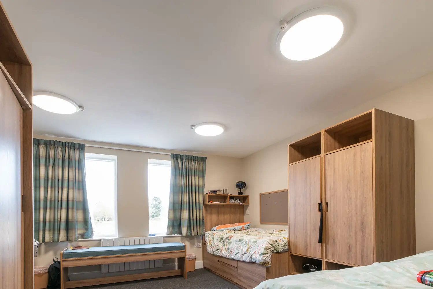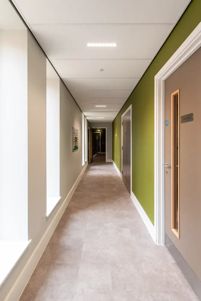 L’éclairage des chambres utilise des luminaires Dot fins et semi-encastrés, tandis que le salon de télévision commun est équipé de downlights Flexblox encastrés. Le nouveau luminaire de secours Firefly a été utilisé dans l’ensemble du bâtiment, associé à des panneaux de sortie lumineux Lexi afin d’assurer un éclairage de secours totalement fiable en cas de coupure de courant. L’extérieur du bâtiment est éclairé par des luminaires Realta muraux, tandis que les allées sont éclairées par des bornes lumineuses Passway et des projecteurs Starbeam Eco montés sur mât.